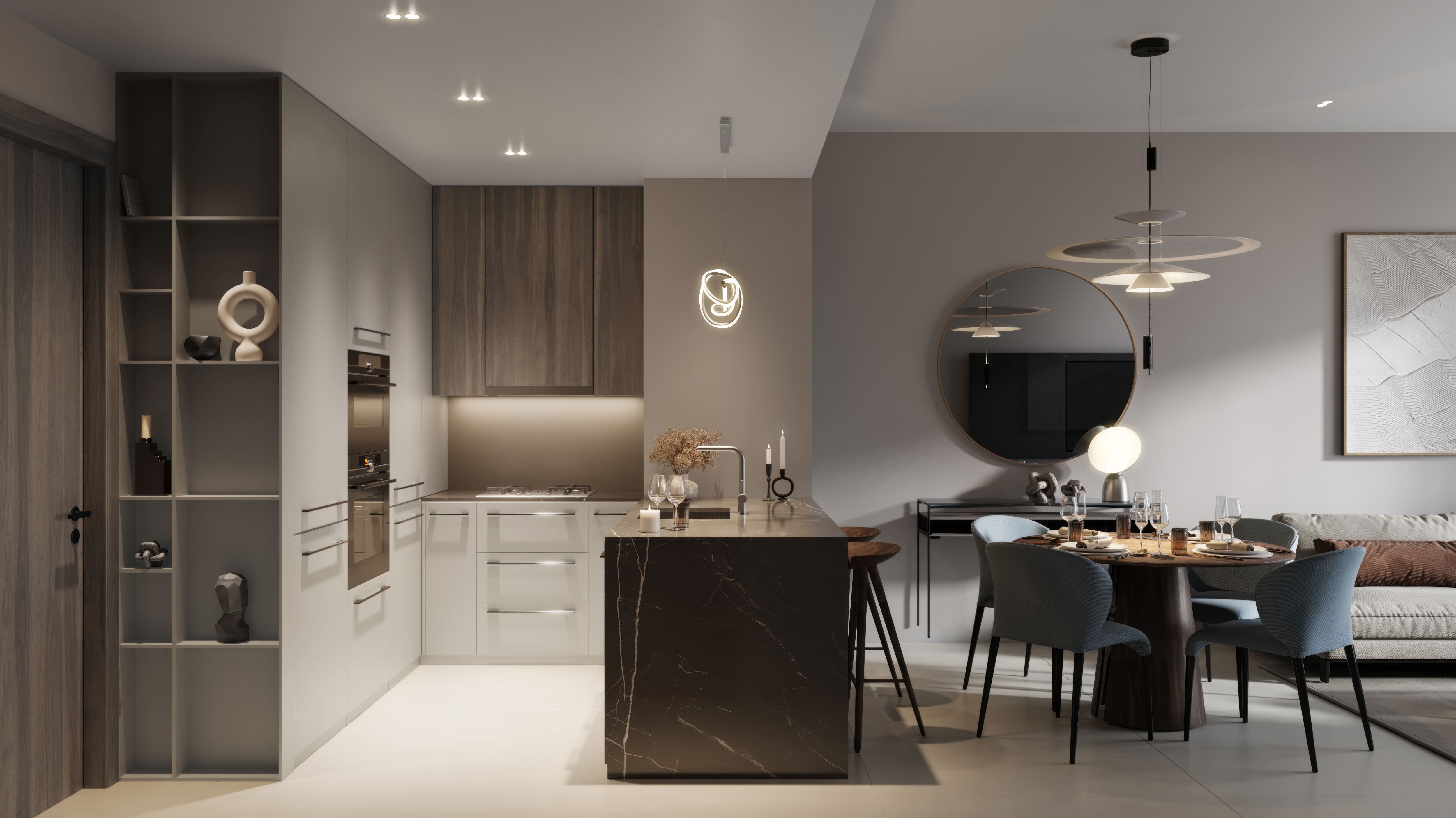 Обідня зона плавно інтегрується в простір, доповнена круглим столом і зручними стільцями з м’якою оббивкою. Композицію підкреслюють підвісний світильник Flos та велике кругле дзеркало, що додає глибини простору.