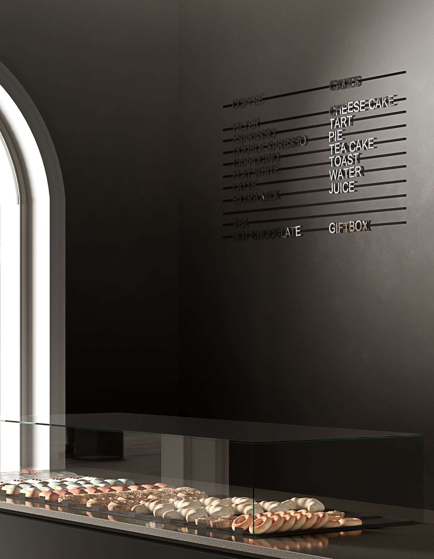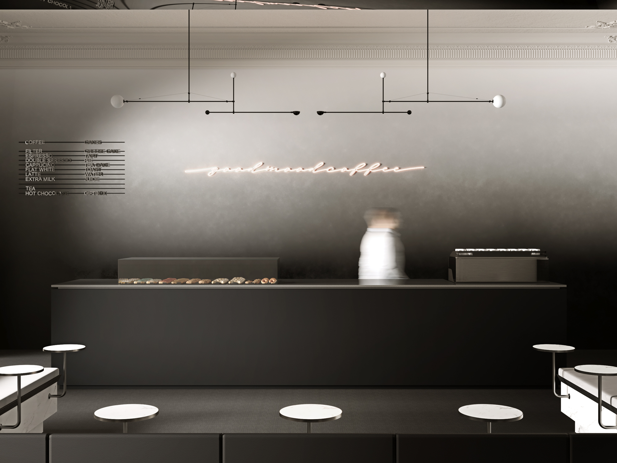 Зона загального простору – ядро всього інтер’єру, яке нагадує острів. Унікальність цієї зони полягає в тому, що вона доступна як зовні, так і зсередини. Простір перекреслений дзеркальними металевими листами на стелі, які створюють ефект просторової глибини та сучасного акценту. Ця зона є ідеальним місцем для відпочинку за кавою та спілкування.