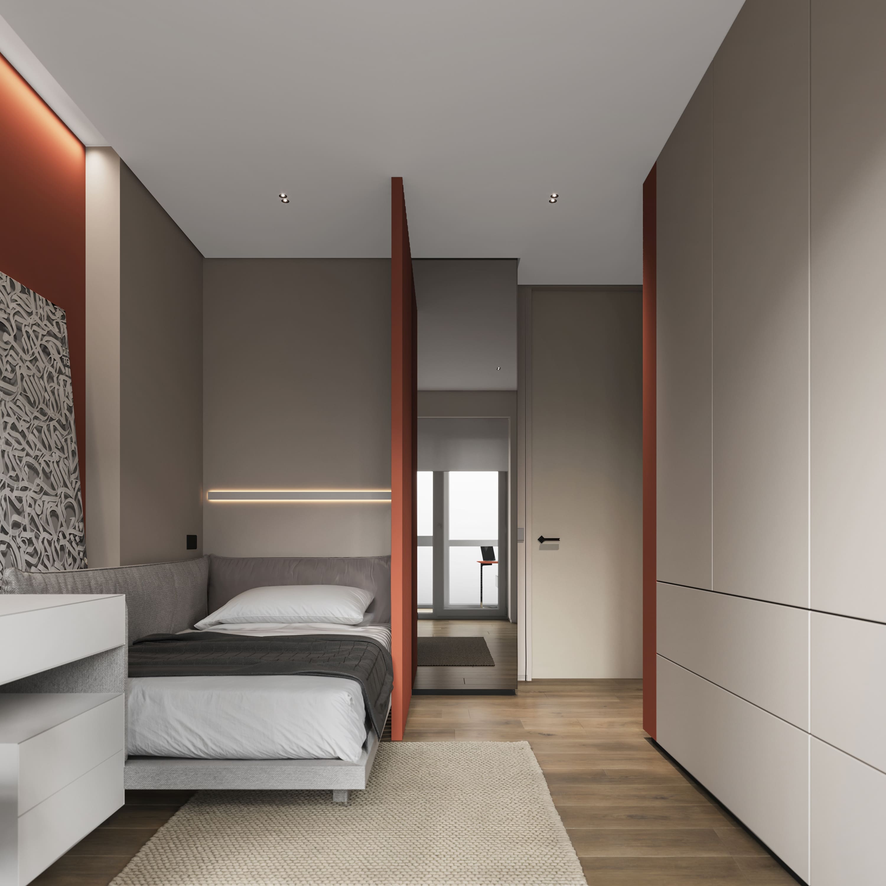 Стильний і продуманий простір для дитини, де акцентні теракотові кольори додають інтер'єру енергію та динаміку. Завдяки реєчній перегородці кімната поділена на функціональні зони, що дозволяє створити окремий затишний простір для відпочинку, водночас зберігаючи легкість і простір за рахунок проміжків між рейками.