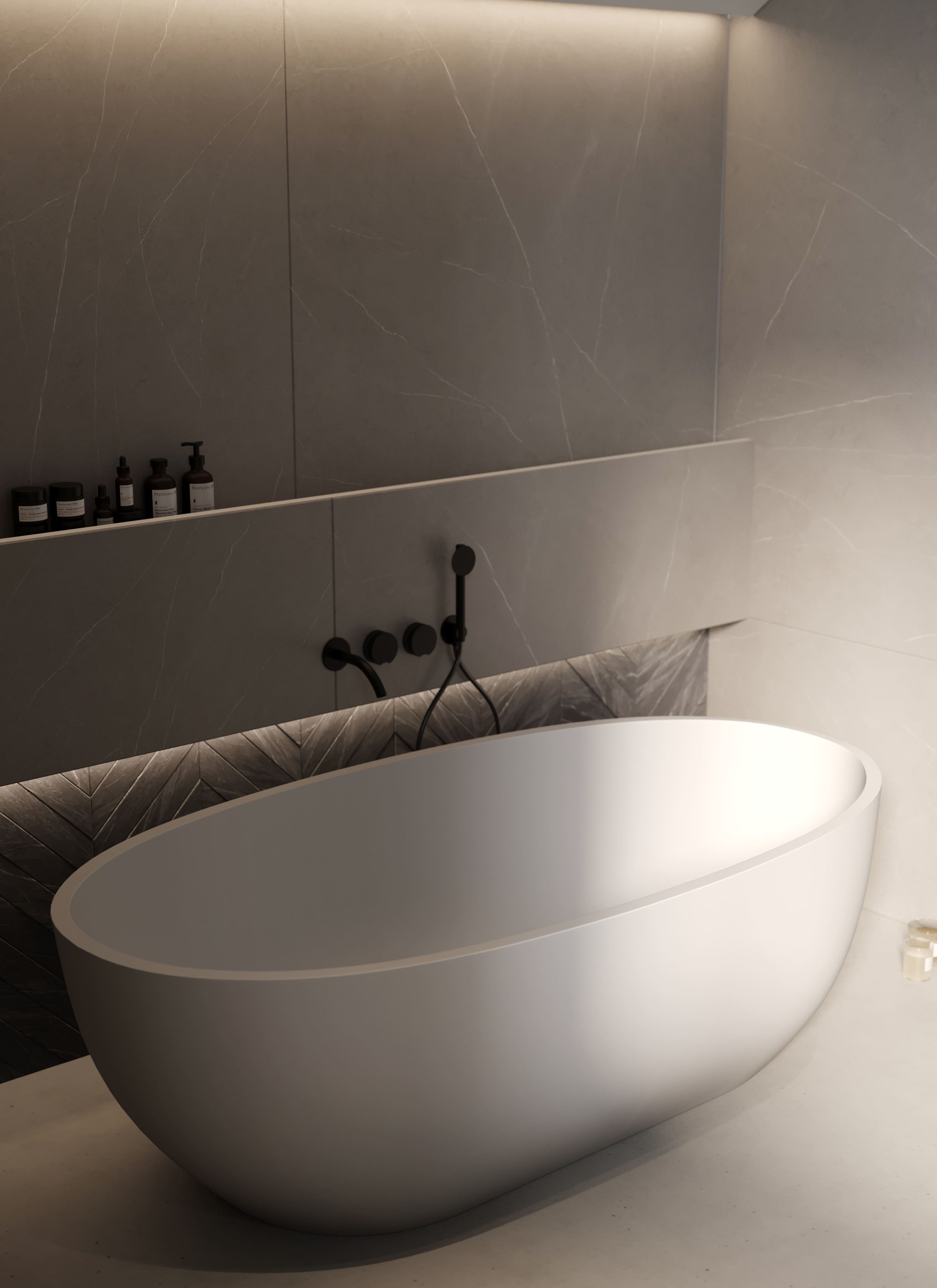 Центральним елементом простору є вільностояча ванна, а за нею ми розмістили напівприховану полицю для зручного та естетичного зберігання засобів догляду. Душова зона, розташована навпроти ванни, оформлена керамогранітом, викладеним у візерунку «ялинка», що додає інтер'єру динамічності. Чорні матові змішувачі створюють стильний контраст, підкреслюючи характер дизайну.